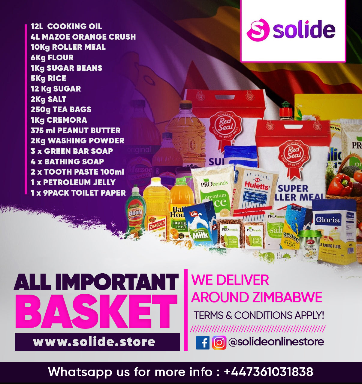 12L Cooking oil | 4L Mazoe orange crush  | 10Kg Roller meal | 6Kg Four | 1Kg Sugar beans | 5Kg Rice | 12Kg Sugar | 2Kg Salt | 250g Tea Bags | 1kg Cremora | 375 Peanut butter | 2kg Washing Powder | 3 X Green Bar Soap | 4 X Bathing Soap | 2 X 100ml Tooth Pase | 1 X Petroleum Jelly