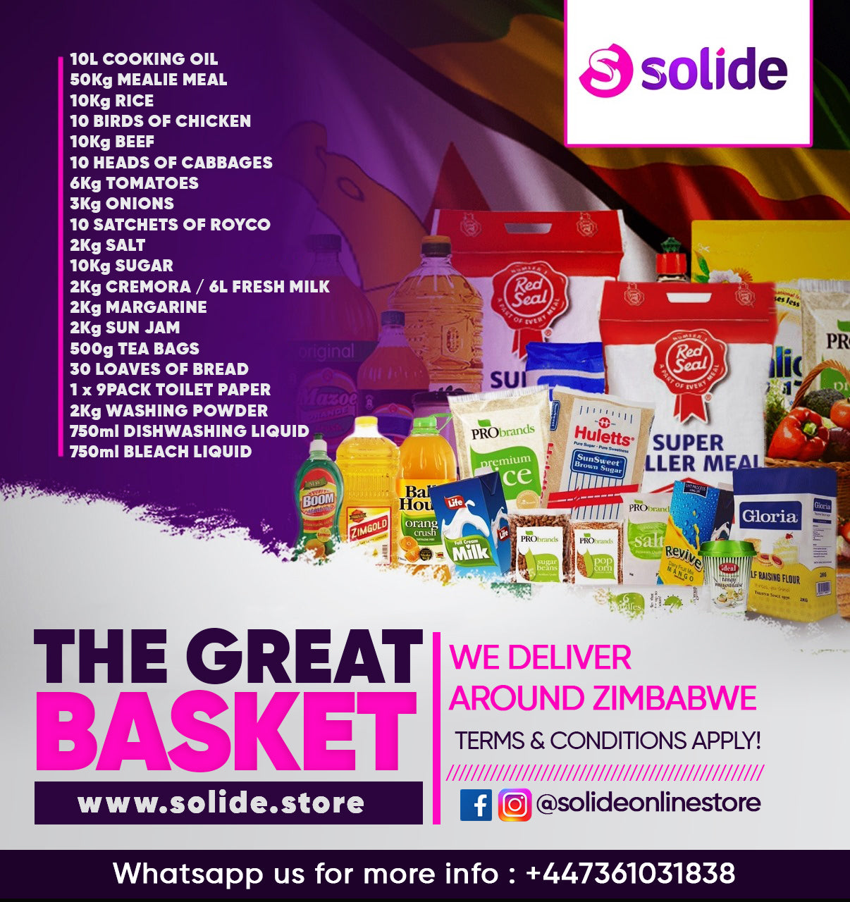 10L Cooking Oil | 50Kg Meali Meal | 10kg Rice | 10 X Birds of Chicken | 10kg Beef | 10 Heads of Cabbages | 6Kg Tomatoes | 3Kg Onions | 10 X Satchets of Royco | 2Kg Salt | 10Kg Cremora / 6L Fresh Milk | 2Kg Margarine | 2Kg Sun Jam | 500g Tea Bag | 30 Loaves Of Bread | 1 X 9pack Toilet Paper | 2Kg Washing Powder | 750ml Dishwashing Liquid | 750Bleach Liquid